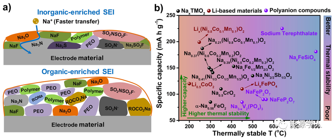 圖4 a)陽極表面無機物種富集SEI(頂部)和有機物種富集SEI的示意圖。b)各種SIBs正極材料的比容量和熱穩(wěn)定性的比較(熱穩(wěn)定性數據通過DSC測定脫鈉態(tài)材料獲得)。