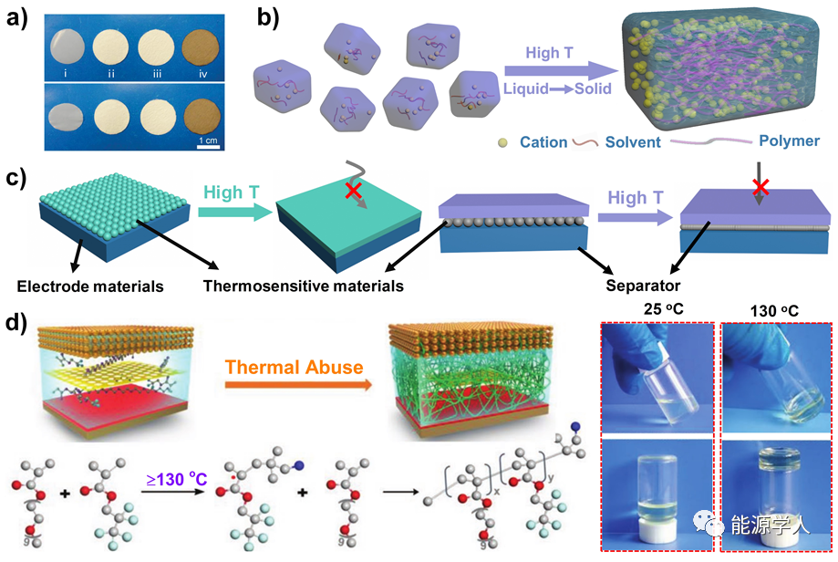 圖6 a) Celgard隔膜(i)、玻璃纖維(ii)、GF/PVDF-HFP(iii)和GF/PVDF-HFP/PDA(iv)在室溫下(頂部)和在200 °C下熱處理30分鐘(底部)后的照片。b)高溫自聚電解質作為熱停堆材料的原理圖。c)熱響應涂層和隔膜示意圖。d)智能溫度響應電解液(PPE)在電池中的熱響應行為及其在熱濫用條件下的自由基聚合機理的示意圖,以及25°C和130°C熱濫用后PPE的光學照片。