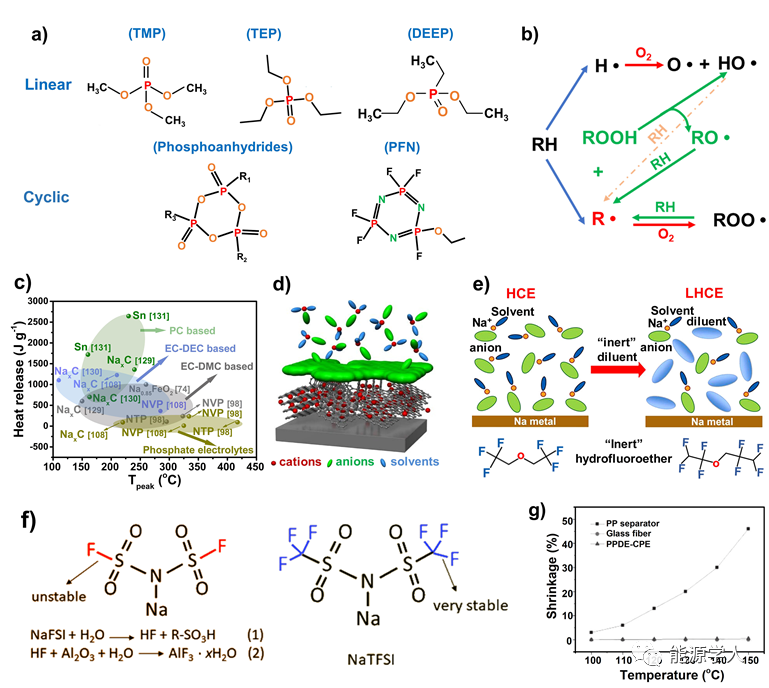 圖5 a)幾種代表性有機磷酸鹽的化學結構。b)有機磷的阻燃機理。c)在PC-/EC-DEC-/EC-DMC電解液和磷酸鹽電解液(NTP: NaTi2(PO4)3;NVP:NaV2(PO4)3)中各種電極材料的放熱溫度和總熱量。d)陽離子在阻燃的高濃電解液中插入碳質負極的行為。e)從HCE到LHCE的稀釋過程示意圖,以及氫氟醚的代表性化學結構。f)NaFSI(左)和NaTFSI(右)的化學結構。(g)聚丙烯分離器、玻璃纖維和PPDE-CPE的熱收縮率為100至150 °C。
