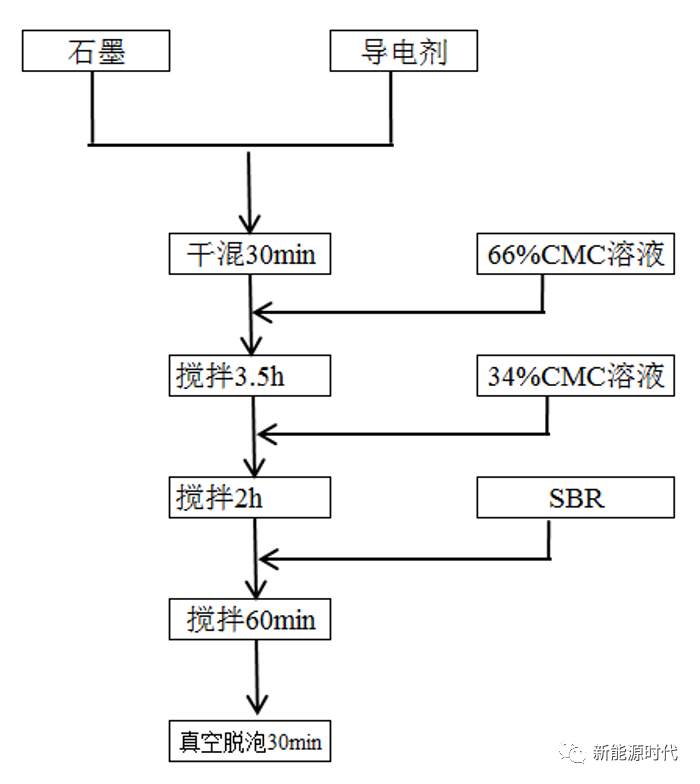 (1)干混:使粉體充分混合,固體之間的混合比在液體下固體間的混合容易多了。同時防止CMC團聚,縮短CMC溶解時間。(2)捏合:高固含量下漿料比較硬,攪拌槳運動時可以對漿料進行摩擦剪切,同時由于攪拌槳呈麻花結構,運動時會對漿料產生向下的擠壓作用。一方面可以使大顆粒破碎掉,另外使CMC包覆在石墨表面,由于CMC帶正電,包覆在石墨表面后形成雙電層結構,石墨間由于靜電排斥,可以防止石墨顆粒間團聚。生產采用60~63%固含量攪拌,出于對設備損耗的考慮,由于生產采用200L和650L的攪拌罐,高固含量下,電機功率無法承受,因此采用低粘度攪拌。低粘度下不利于CMC的包覆,因此攪拌時間須延長。(3)第二步加CMC:CMC分子鏈基團與水分子存在氫鍵作用,懸浮在溶液中形成龐大的空間位阻,防止?jié){料沉降。(4)攪拌分散時間:使CMC充分溶解。生產采用2h攪拌是利用漿料剪切變稀的原理降低漿料粘度,使?jié){料可以做到較高固含量。