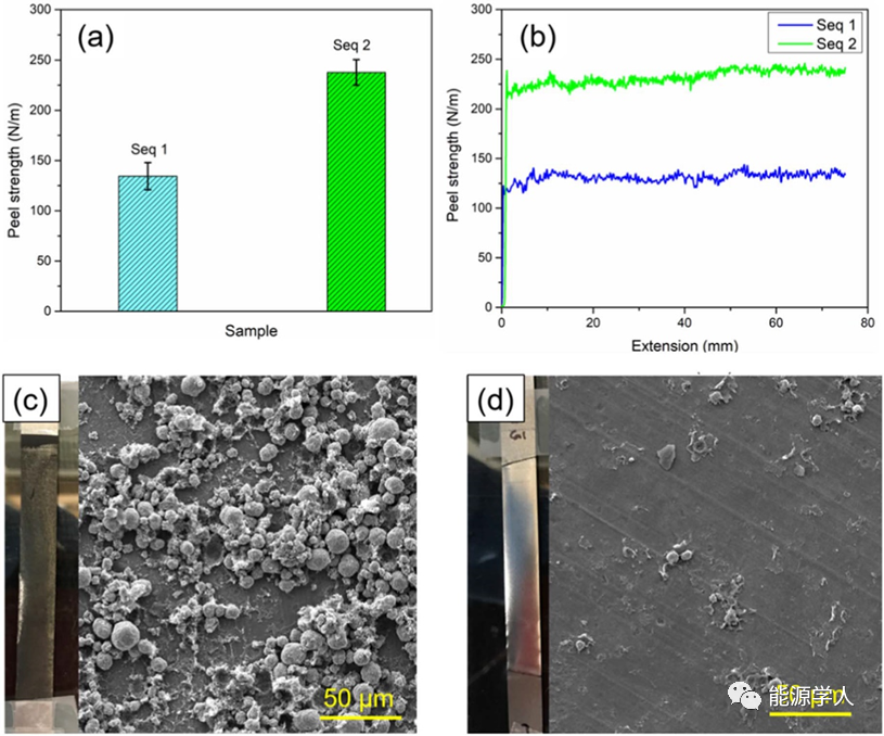 圖5.兩種順序制備電極的粘結(jié)強(qiáng)度測量(a)剝離強(qiáng)度圖(b)剝離強(qiáng)度-延伸率曲線(c)和(d)分別是剝離測試后對應(yīng)于的電極表面