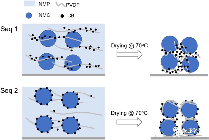 因此,順序1制成的漿料的“強(qiáng)度”由PVDF鏈的纏結(jié)和CB的填充效應(yīng)共同提供。順序2制成的漿料的“強(qiáng)度”主要由PVDF鏈的纏結(jié)提供。導(dǎo)致順序2制成的漿料流動(dòng)性較好。在干燥過程中,使用順序1制得的漿料隨著NMP的蒸發(fā),CB納米顆粒被捕集在PVDF聚合物基質(zhì)中,形成了填充NMC顆粒之間空間的多孔CB/PVDF簇。在干燥使用順序2制得的漿料時(shí),附著在NMC顆粒上的CB納米顆粒會吸收PVDF,從而在NMC顆粒上形成致密的CB/PVDF層。