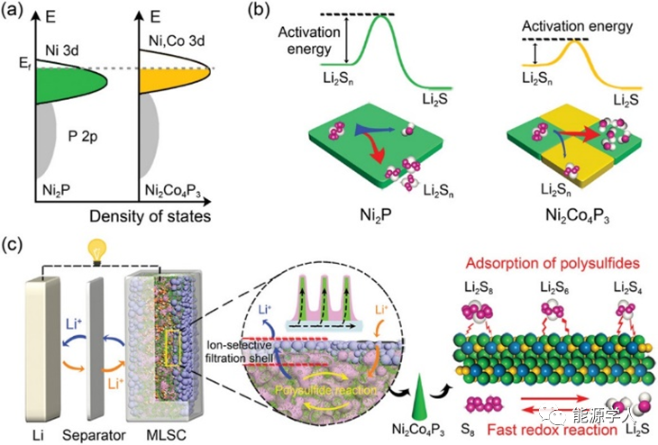 綜上,通過引入氮空位缺陷,能夠調控催化劑的電子結構,從而改善對多硫化物的吸附與催化性能。通過變溫CV測試,結合阿倫尼烏斯方程,引入氮空位后的多硫化物轉化能壘僅為8.11 kJ mol–1,小于Ni3N的21.11 kJ mol–1。基于該催化劑設計,在1000圈的長循環(huán)過程中,容量衰減僅為每圈0.039%,即使在5.2 mg cm–2的高負載下,依然可以穩(wěn)定循環(huán)100圈。該文章結合實驗與理論計算,揭示了催化劑電子結構與吸附和催化性能之間的內在聯(lián)系,對于進一步設計高活性鋰硫催化劑具有重要的意義。 Zihan Shen, Zili Zhang, Matthew Li, Yifei Yuan, Yue Zhao, Shuo Zhang, Chenglin Zhong, Jia Zhu, Jun Lu*, and Huigang Zhang*, Rational design of a Ni3N0.85 electrocatalyst to accelerate polysulfide conversion in lithium-sulfur batteries, ACS nano, 2020, DOI:10.1021/acsnano.9b09371Zihan Shen, Mengqiu Cao, Zili Zhang, Jun Pu, Chenglin Zhong, Jiachen Li, Haixia Ma, Fujun Li, Jia Zhu, Feng Pan, Huigang Zhang, Efficient Ni2Co4P3 Nanowires Catalysts Enhance Ultrahigh‐Loading Lithium–Sulfur Conversion in a Microreactor‐Like Battery, Advanced Functional Materials, 2019, 30(3), 1906661 , DOI: 10.1002/adfm.201906661