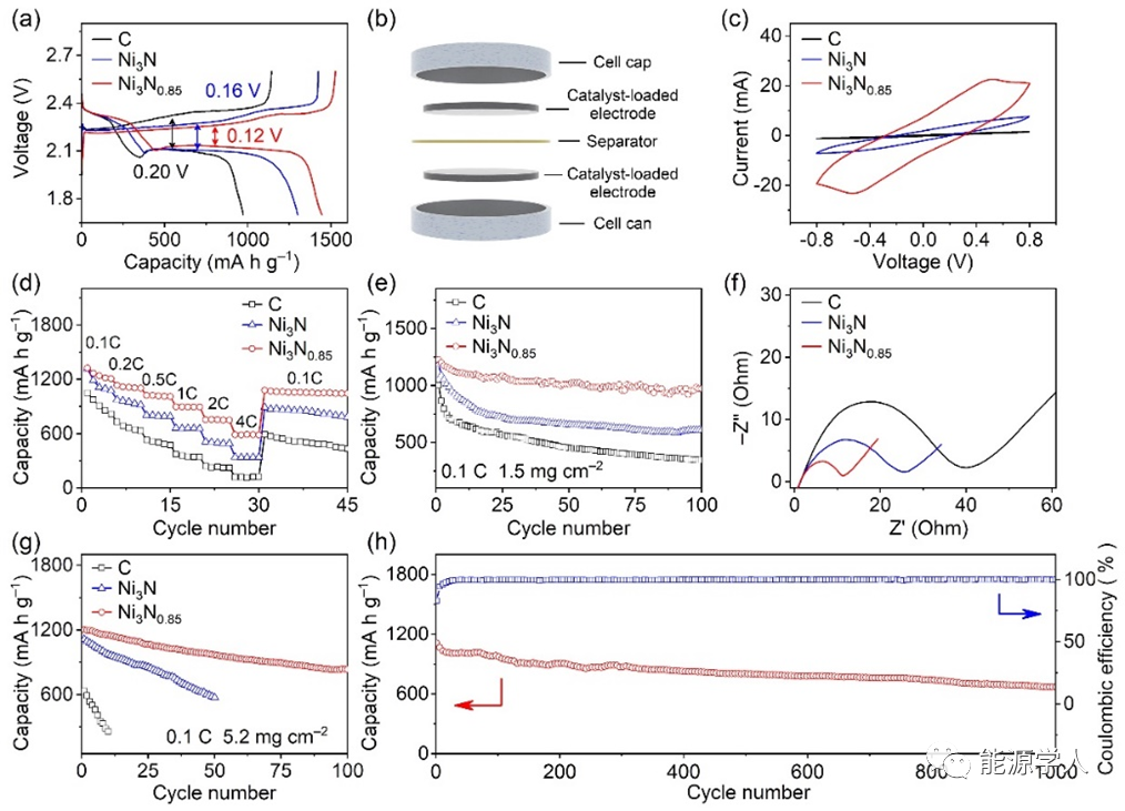 電化學性能表征如圖6所示,以0.02 C倍率充放電,添加Ni3N0.85催化劑的極化電壓僅為0.12 V,在1.5 mg cm–2負載量下,循環(huán)1000圈后的比容量保持在669.4 mAh g–1,容量衰減僅為每圈0.039%。即使在5.2 mg cm–2負載量下,依然可以穩(wěn)定循環(huán)100圈。