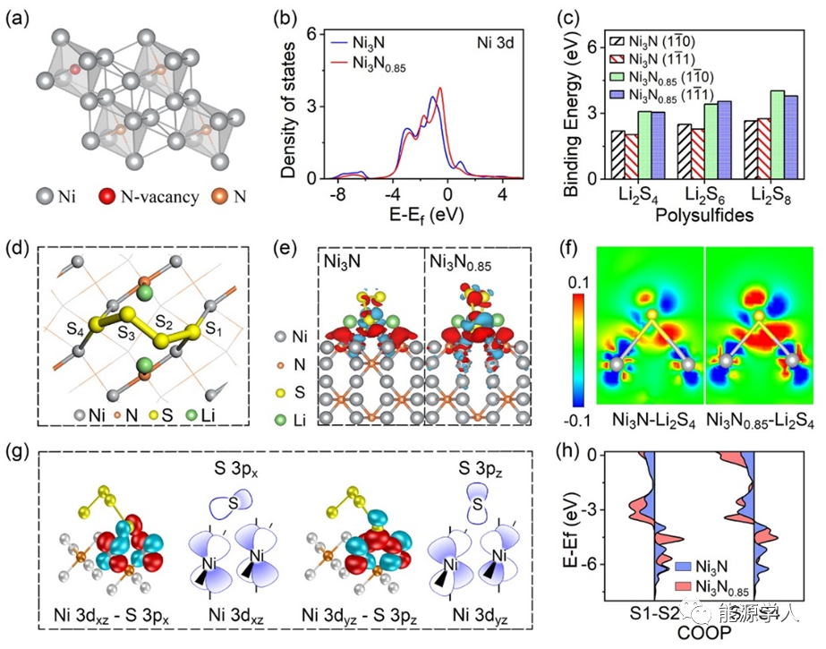 為了在分子層面上揭示氮空位引入后的催化特性,如圖4所示,第一性原理計算表明,引入氮空位后,金屬Ni的3d軌道向費米能級方向移動,增強了多硫化物的吸附性能。差分電荷密度顯示出金屬Ni原子與多硫化物中的S原子之間存在較強的電荷轉移。作者進一步通過Wannier計算,表明該電荷轉移主要是由于金屬Ni的3dxz,3dyz軌道分別與端基S的3px,3pz軌道重疊,電子從金屬Ni的3d軌道上轉移并填充到端基S原子的LUMO軌道上,使得端基S-S鍵的反鍵態(tài)增加,從而弱化了S-S鍵,催化了多硫化物轉化。