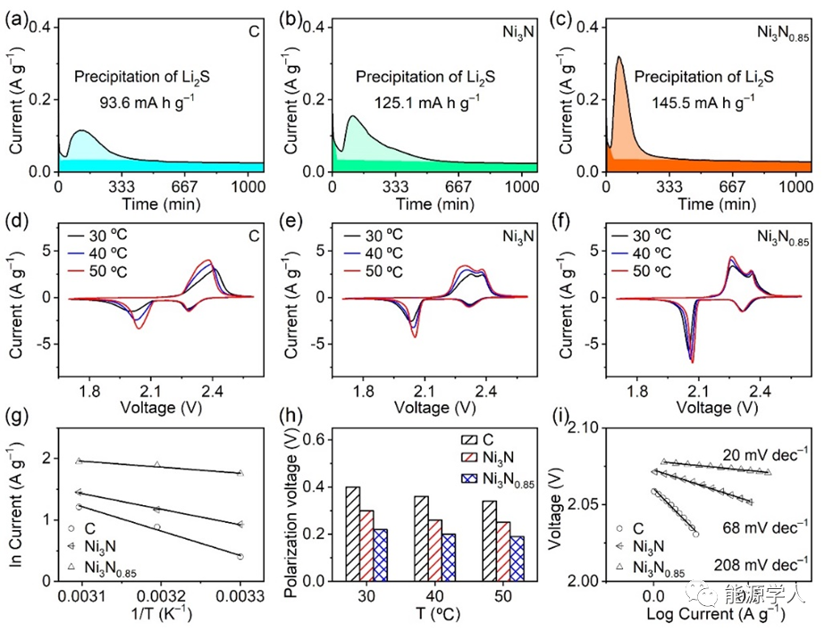 首先,如圖3a-c所示,作者通過Li2S成核實驗證明在相同過電位下,Ni3N0.85具有更優(yōu)異的催化性能,同時,如圖3d-f所示,變溫CV測試結合阿倫尼烏斯方程可推導出Ni3N0.85中的多硫化物轉化能壘僅為8.11kJ mol–1,實驗證明了Ni3N0.85具有優(yōu)異的催化性能。