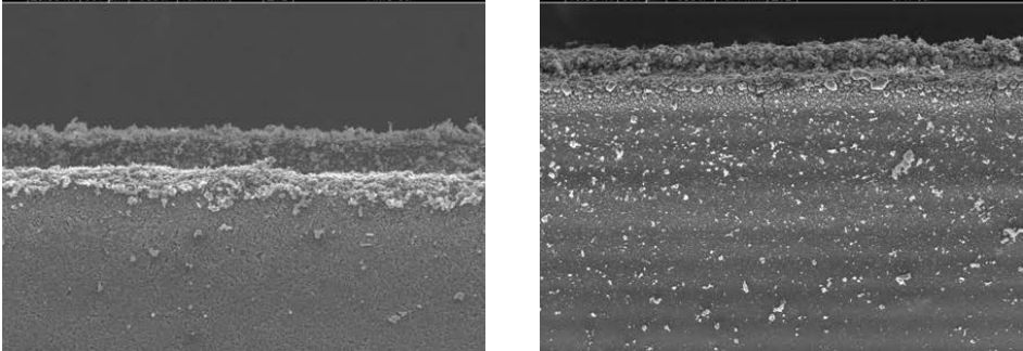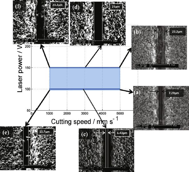 其中,激光能量和切割移動速度是兩個主要的工藝參數(shù),對切割質(zhì)量影響巨大。圖5是不同的激光切割工藝條件下單面涂層負極極片的切邊形貌,圖6是不同的激光切割工藝條件下單面涂層正極極片的切邊形貌。當激光功率太低或者移動速度太快時,極片不能完全切開,而當功率太高或移動速度太低時,激光對材料作用區(qū)域變大,切縫尺寸更大。