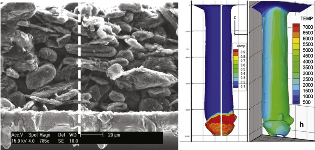 由于鋰離子電池極片是雙面涂層+中間集流體金屬層的結(jié)構(gòu),而且涂層與金屬箔材之間性質(zhì)差異大,對激光作用的響應也不相同。激光作用在負極石墨層或正極活物質(zhì)層時,由于它們具有很高的激光吸收率,導熱系數(shù)也很低,因此,涂層需要相對較低的熔化和汽化激光能量,而金屬集流體對激光具有反射作用,并且熱傳導快,因此金屬層的熔化和汽化激光能量升高。圖7是單面涂層的負極在激光作用下極片厚度方向的銅成分和溫度分布,當激光作用在石墨層時,由于材料的特性,石墨主要發(fā)生汽化,當激光侵入到金屬銅箔時,銅箔開始發(fā)生熔化,形成熔池。工藝參數(shù)不合適時,可能出現(xiàn)問題:(1)切邊涂層脫落,露出金屬箔材,如圖8左圖所示;(2)切邊周圍出現(xiàn)大量切屑異物。這些都會導致電池出現(xiàn)性能下降、安全性品質(zhì)問題,如圖8右圖所示。因此,當采用激光切割時,需要根據(jù)活物質(zhì)材料和金屬箔材的特性,優(yōu)化合適的工藝參數(shù),才能既完全切割極片,又形成良好的切邊質(zhì)量,不產(chǎn)生金屬切屑雜質(zhì)殘留。